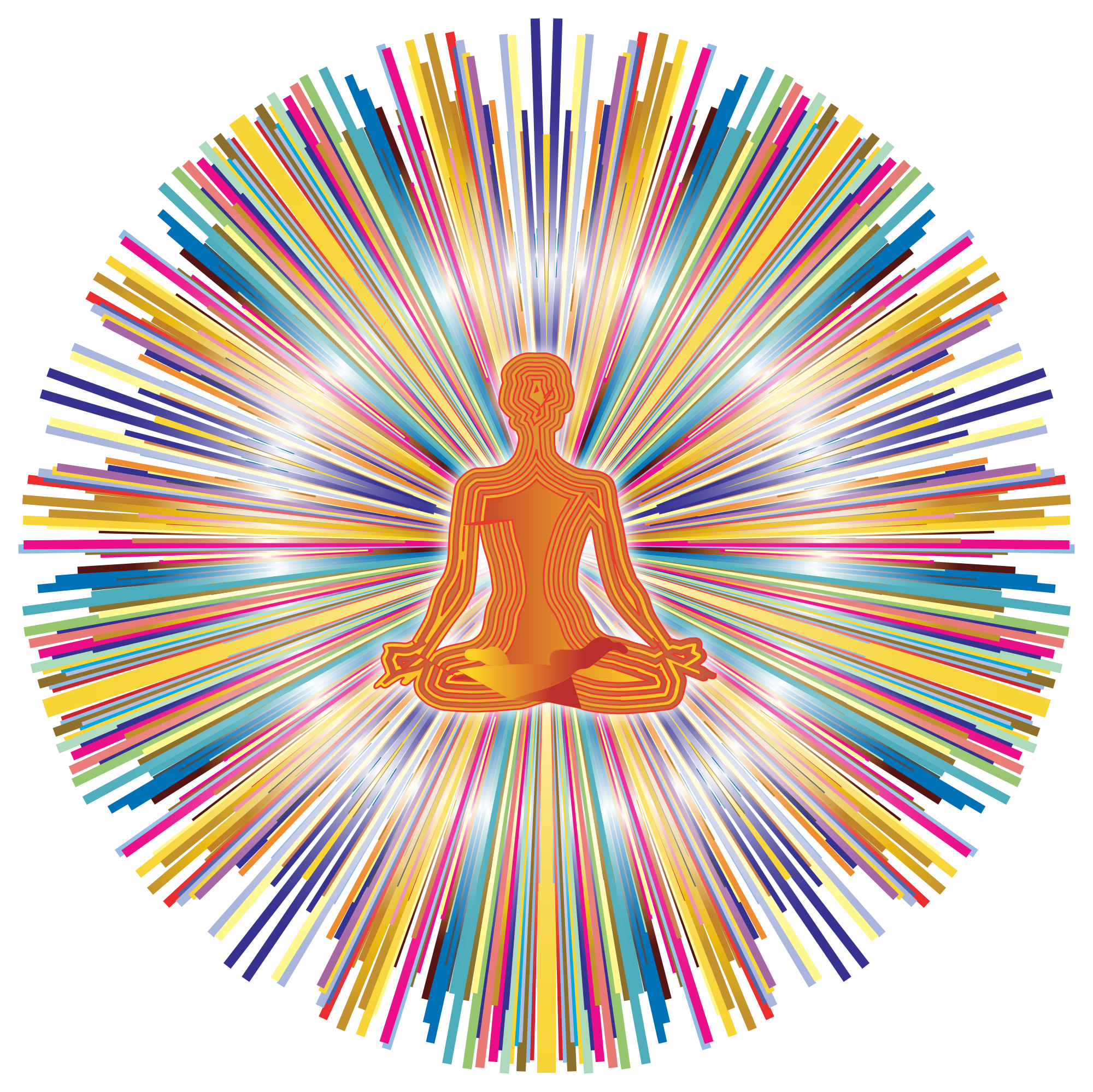 The universal mind bursting forth with rays of rainbow energy from a person deep in mediation