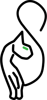 a stylized cartoon outline of a black cat with green eyes