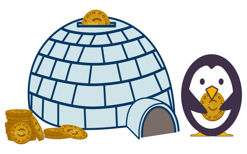 A penguin holding a coin next to a large igloo and a lot of coins.Un manchot tenent une pièce à côté d'une grande tirelire igloo et d'un tas de pièces de monnaie.