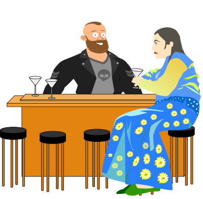drinking lady at a pub with a bartender behind the counter