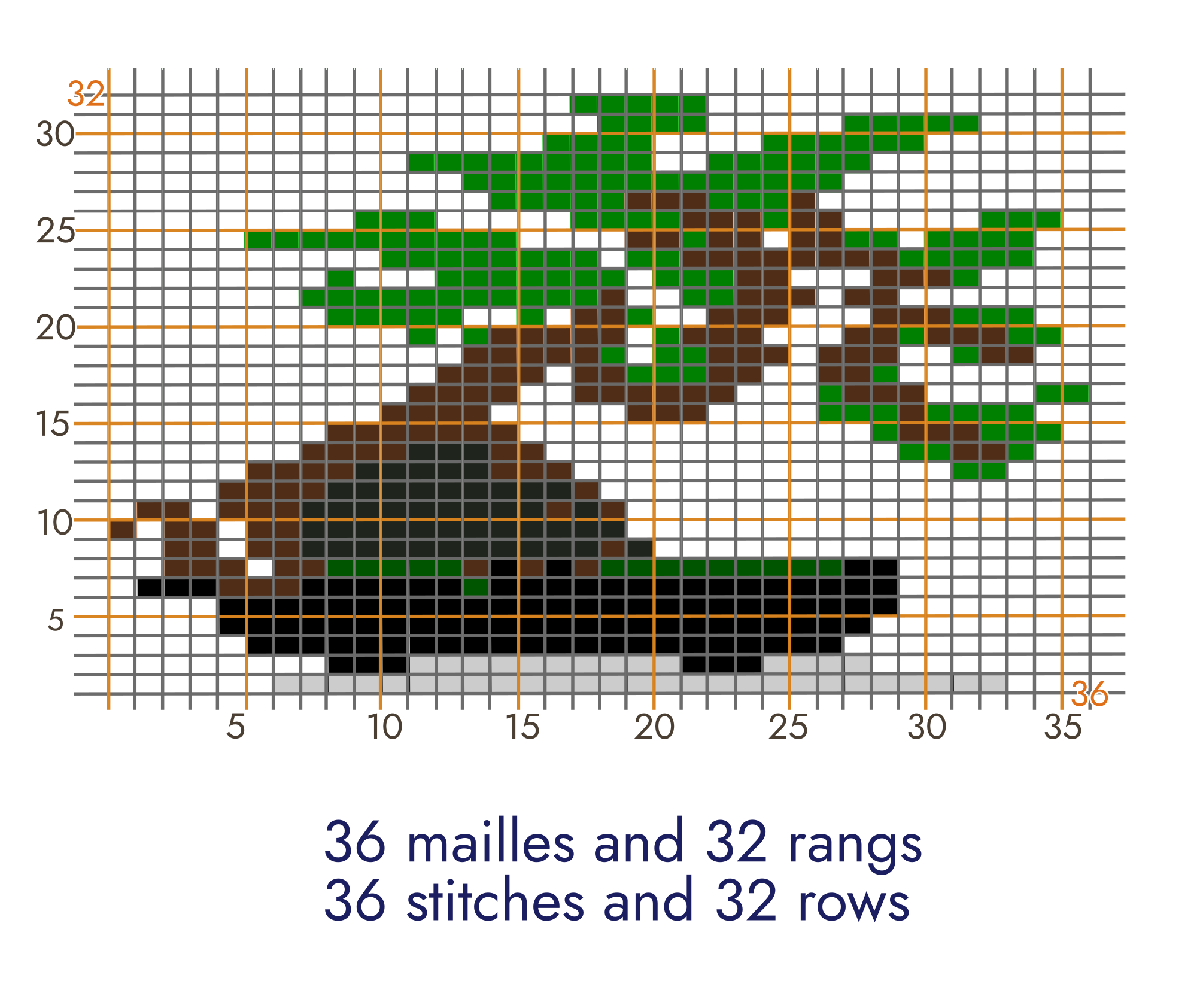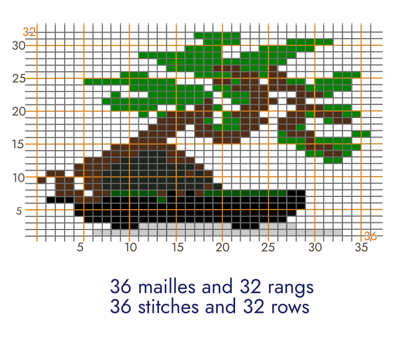 The proportions of the pixel-art bonsai have been changed to make it a chart for knitting. A grid has been added to help find your way around while knitting.