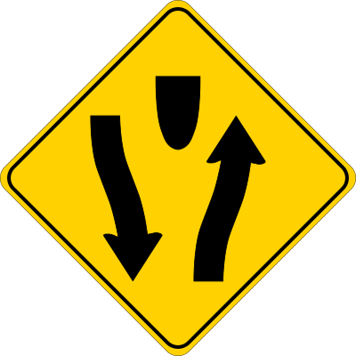 Caution sign (USA style) warning that a divided highway is about to begin.