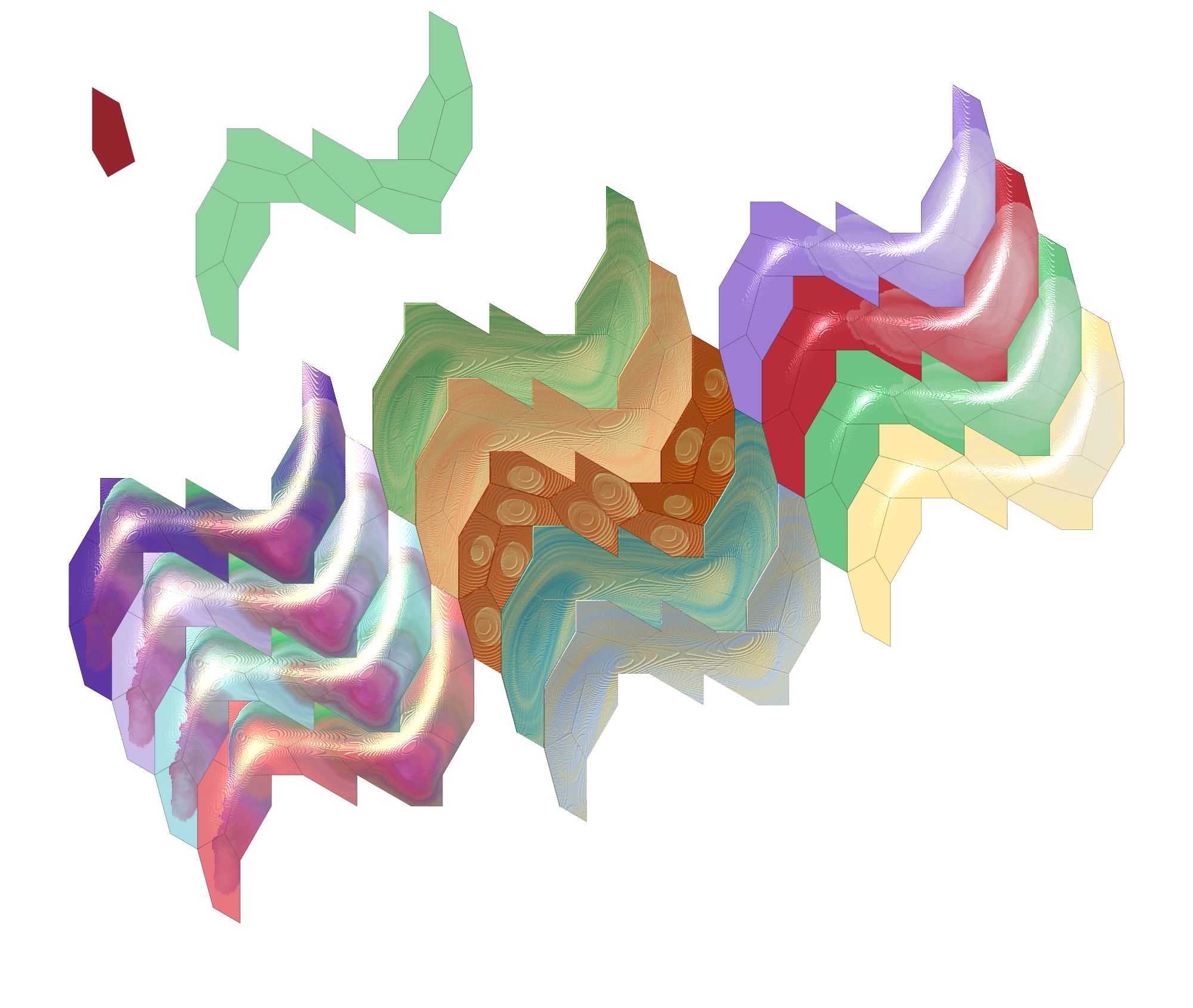 A new distinct tiling was discovered in 2015. This is the dark red pentagon in the top left hand corner. The green group of 12 of this pentagon is the smallest unit that can fill an area simply by translation. 12 of these groups are shown to the bottom right which were filled with a single colour and then three of the options of the Inkscape materials were applied.