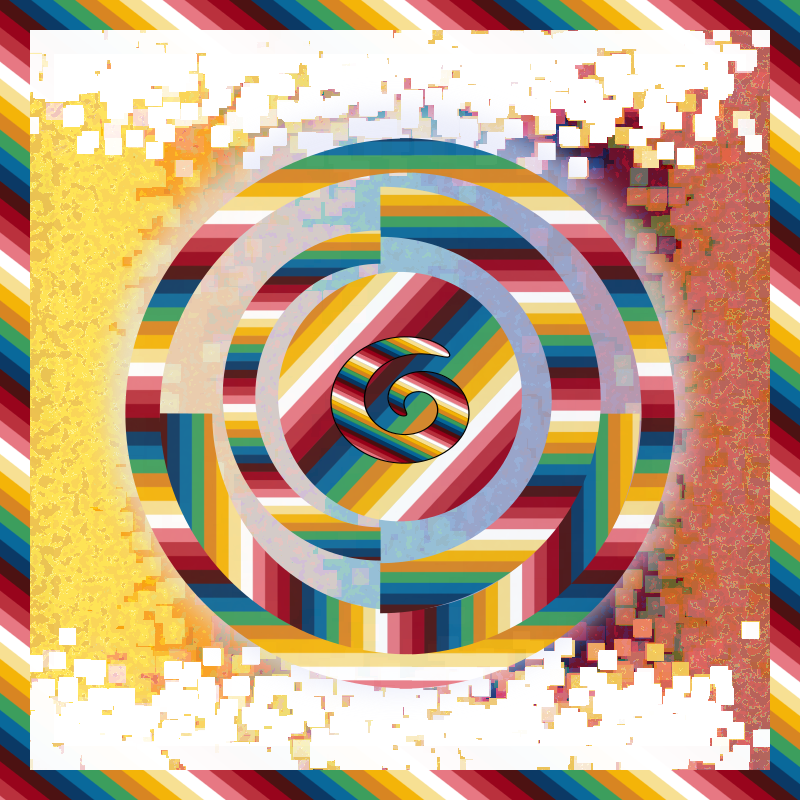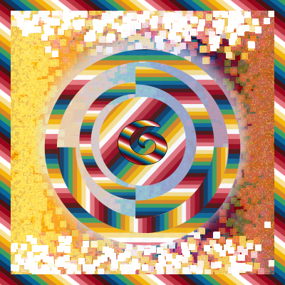 A design inspired by the work of the French painter Delaunay with circles and squares. Almost each part of the drawing has the same pattern a background and borders except the black shape behind the spiral and the pale circle between the square and the other shapes.