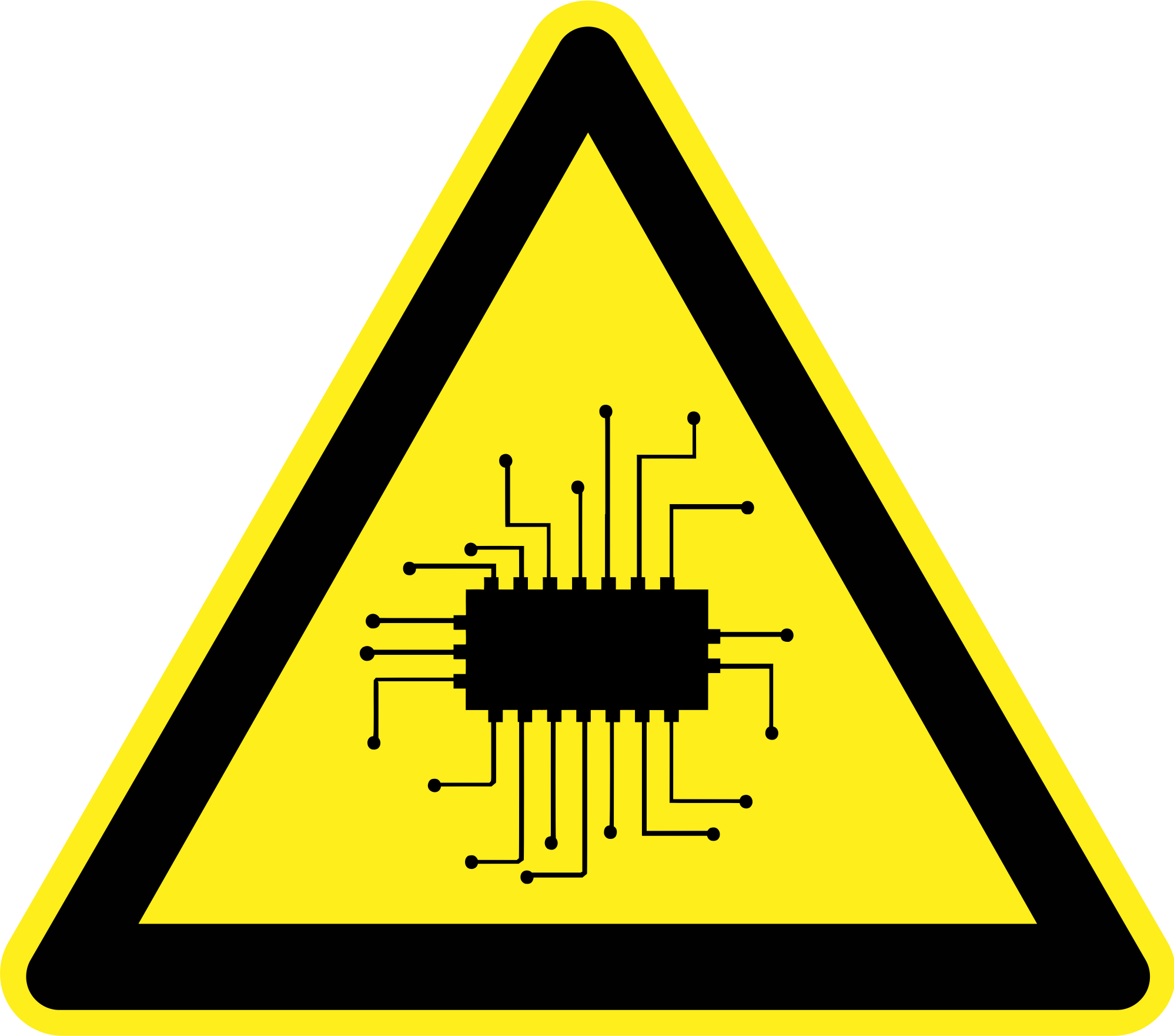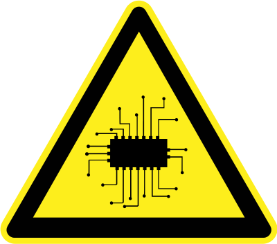 Warning sign with a chip, signifying risk of AI systems.