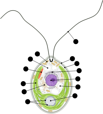 Schematic representation of a Chlamydomonas reinhardtii cell. The original version has the CC0 license (universal public domain) which means who created it waived all of their rights to the work worldwide under copyright law, including all related and neighboring rights, to the extent allowed by law. You can copy, modify, distribute and perform the work, even for commercial purposes, all without asking permission. The original image can be freely accessed in Wikimedia Commons. Please see here: