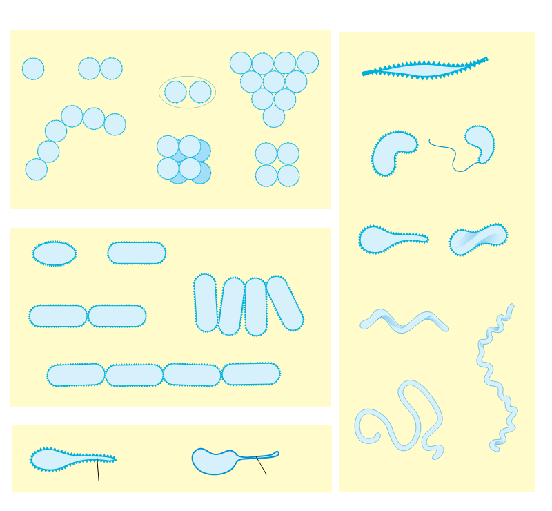 Schematic representation of the bacterial morphology. The original version has the CC0 license (universal public domain) which means who created it waived all of their rights to the work worldwide under copyright law, including all related and neighboring rights, to the extent allowed by law. You can copy, modify, distribute and perform the work, even for commercial purposes, all without asking permission. The original image can be freely accessed in Wikimedia Commons. Please see here: