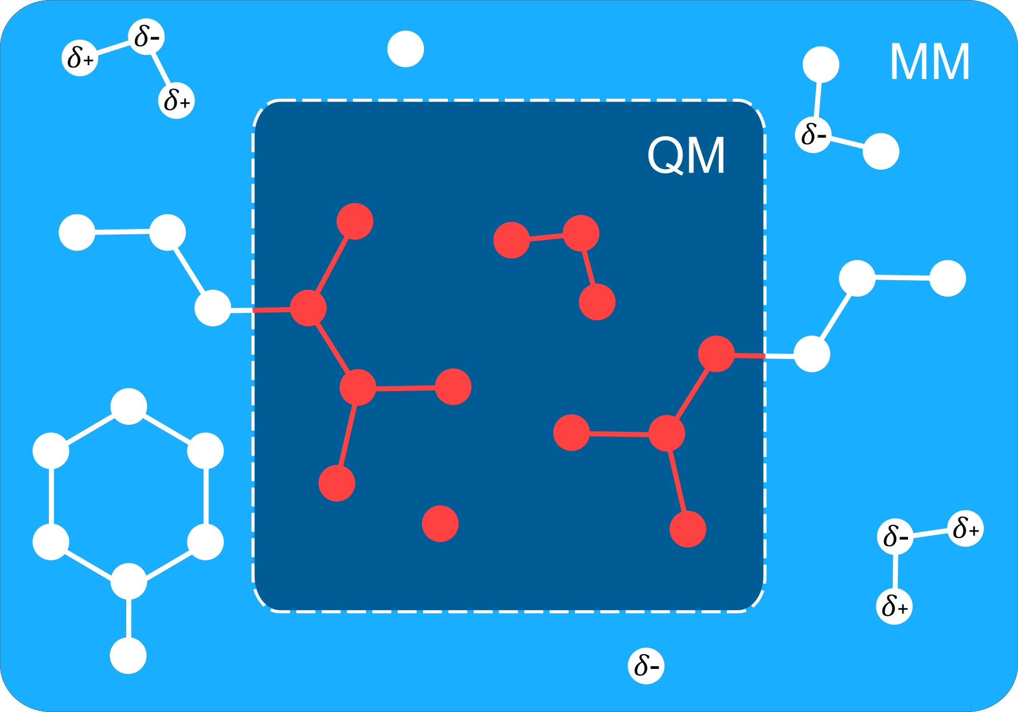 Representation of QM/MM method used in the computational quantum chemistry. The original version has the CC0 license (universal public domain) which means who created it waived all of their rights to the work worldwide under copyright law, including all related and neighboring rights, to the extent allowed by law. You can copy, modify, distribute and perform the work, even for commercial purposes, all without asking permission. The original image can be freely accessed in Bioicons database (https://bioicons.com). Please see here: