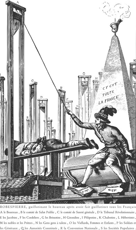 An engraving from 1793 of Robespierre himself guillotining the executioner, vectorized and with explanatory text recreated.