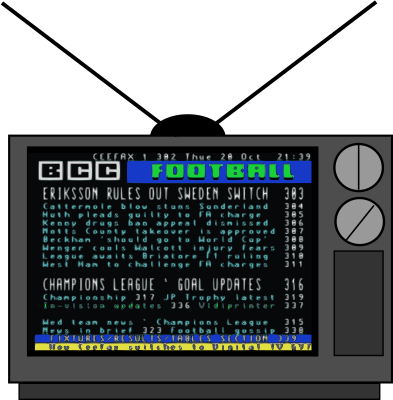 Teletext was a standard invented in the UK for displaying text and rudimentary graphics of news, air flight data, sports, etc on suitably equipped television sets that was quite useful before the era of commonly used internet. I thought I would preserve it's memory as clipart. The displayed text is based on an image that was used and declared public domain on Wikimedia. The logo of the BBC was changed to try to avoid any possible trademark issues, although not sure that would be an issue or not.