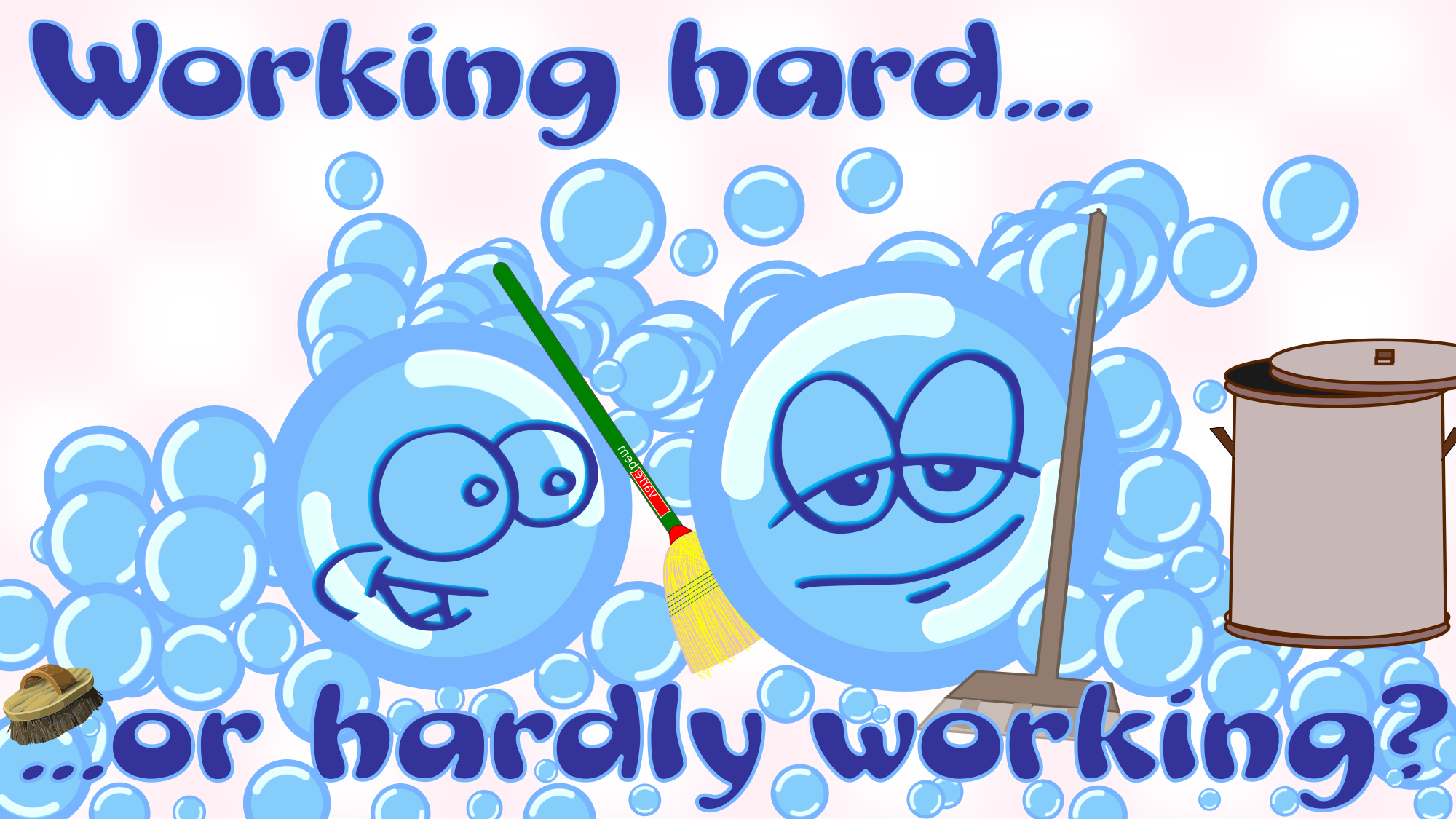 Two anthropomorphized soap bubbles pause in the midst of cleanup work, holding brooms, to chat casually. Text says, "Working hard... or hardly working?" Inspired by a conversation between 3D animators who discussed "how bubbles work" in oceanic scenes.