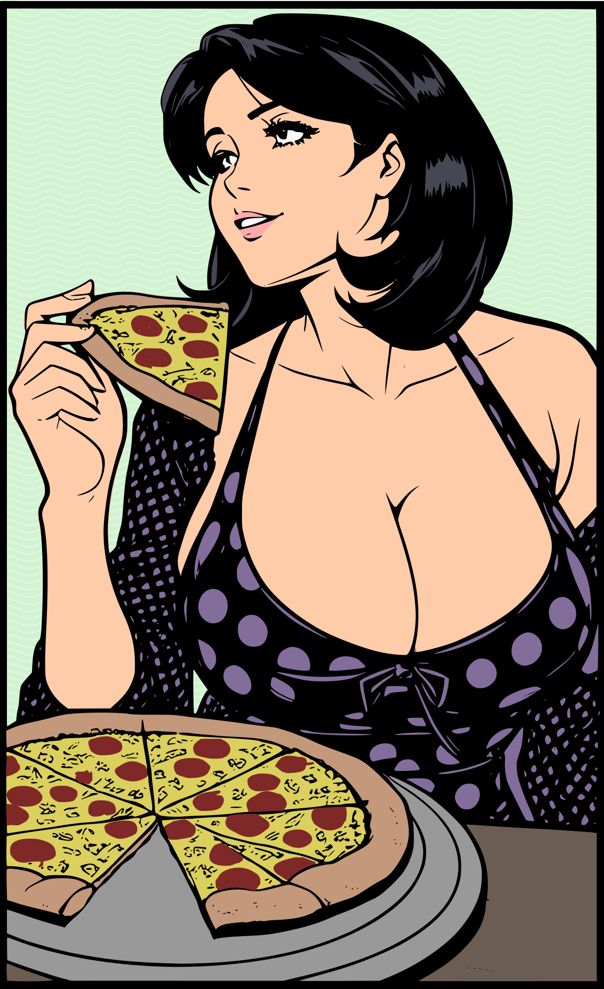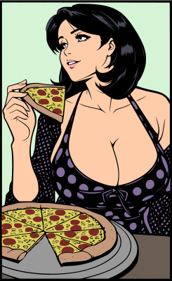 I thought there needed to be a missing slice since the lady is eating a slice of the pizza. Added colour too!