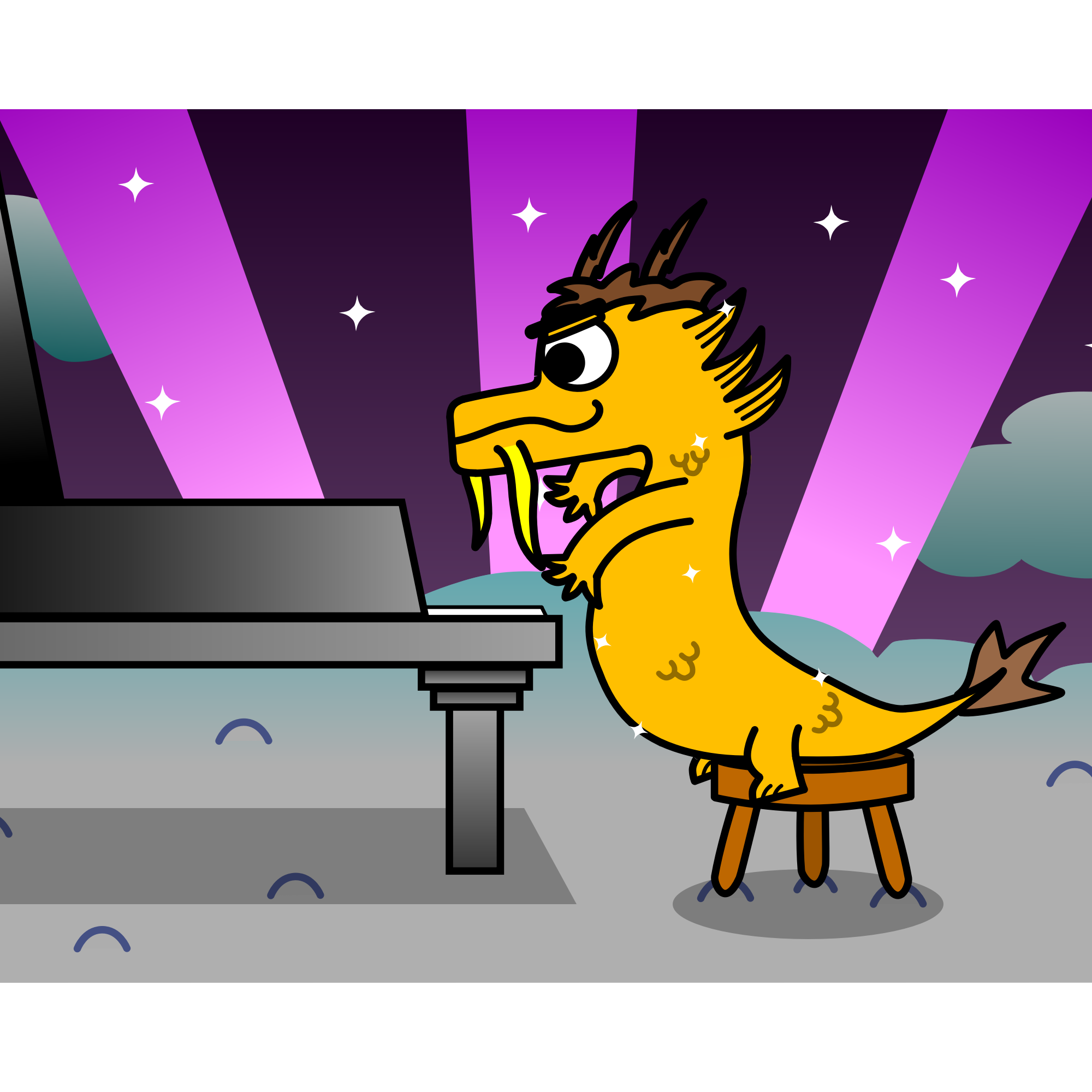 A cartoon chinese dragon (Huanglong) playing a piano in the clouds.