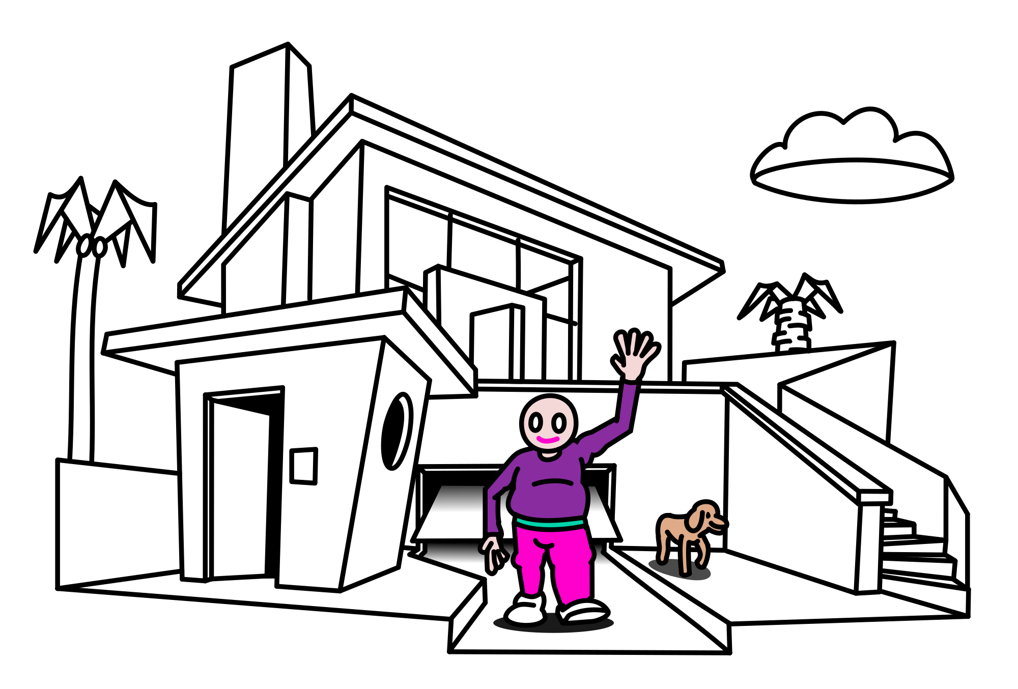 - home house luxury villa architecture garage private proprerty retired old fat man happy dog pensioneer upper class inequity rich retreat perspective palm tree entrance driveway hello