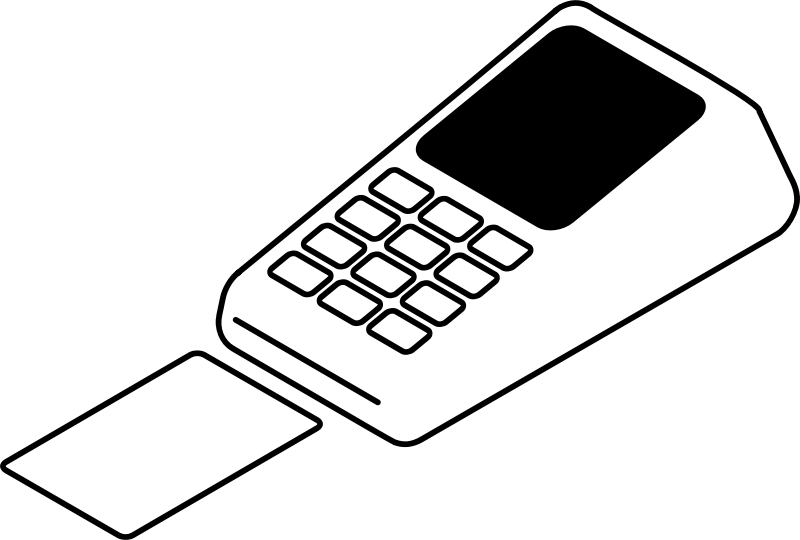 Isometric view of a payment terminal in black and white.