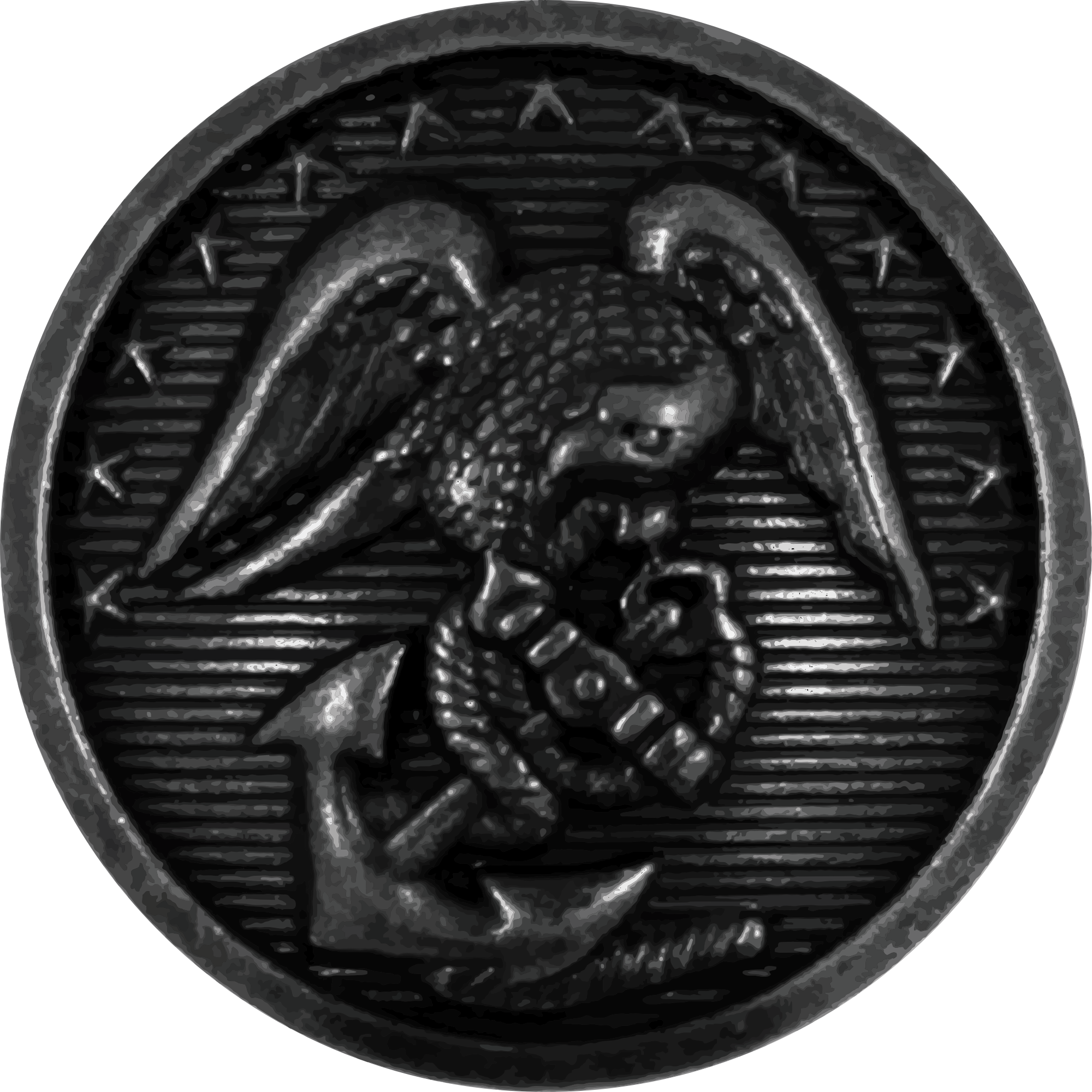 Button from a US Marine Corps Service "A" green uniform blouse (coat). The button is made of brass but is enameled black. The finish is shown as slightly worn so details are visible; if this was not done, very little detail could be seen.