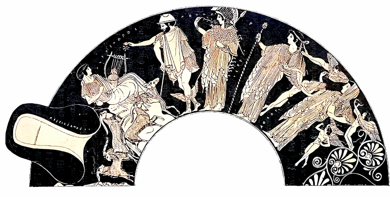 Hermes leads the goddesses Athena, Aphrodite and Hera to the seated Paris, who is to judge the fairest of the three. Source note: "Musée de Berlin. Rayet-Collignon, fig. 81." Histoire de l''art dans l''antiquité. (Paris : Hachette, 1882-1914) Perrot, Georges (1832-1914), Author. Chipiez, Charles (1835-1901), Author. This image is in the public domain. Retrieved from the New York Public Library Digital Collections. Uploaded by Stones of Erasmus. https://www.stonesoferasmus.com.