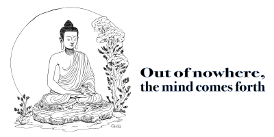 a symbolic Buddha meditating with the famous zen koan quote "Out of nowhere, the mind comes forth"