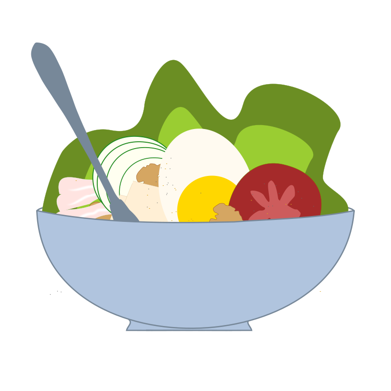 Bol de salade composée : salade, jambon, dés de fromage, œuf, tomate, concombre, noix assaisonnée de graines et de poivre. Et, évidemment une fourchette pour manger le tout.