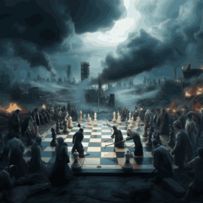 AI generated chessboard with humans fighting on it.