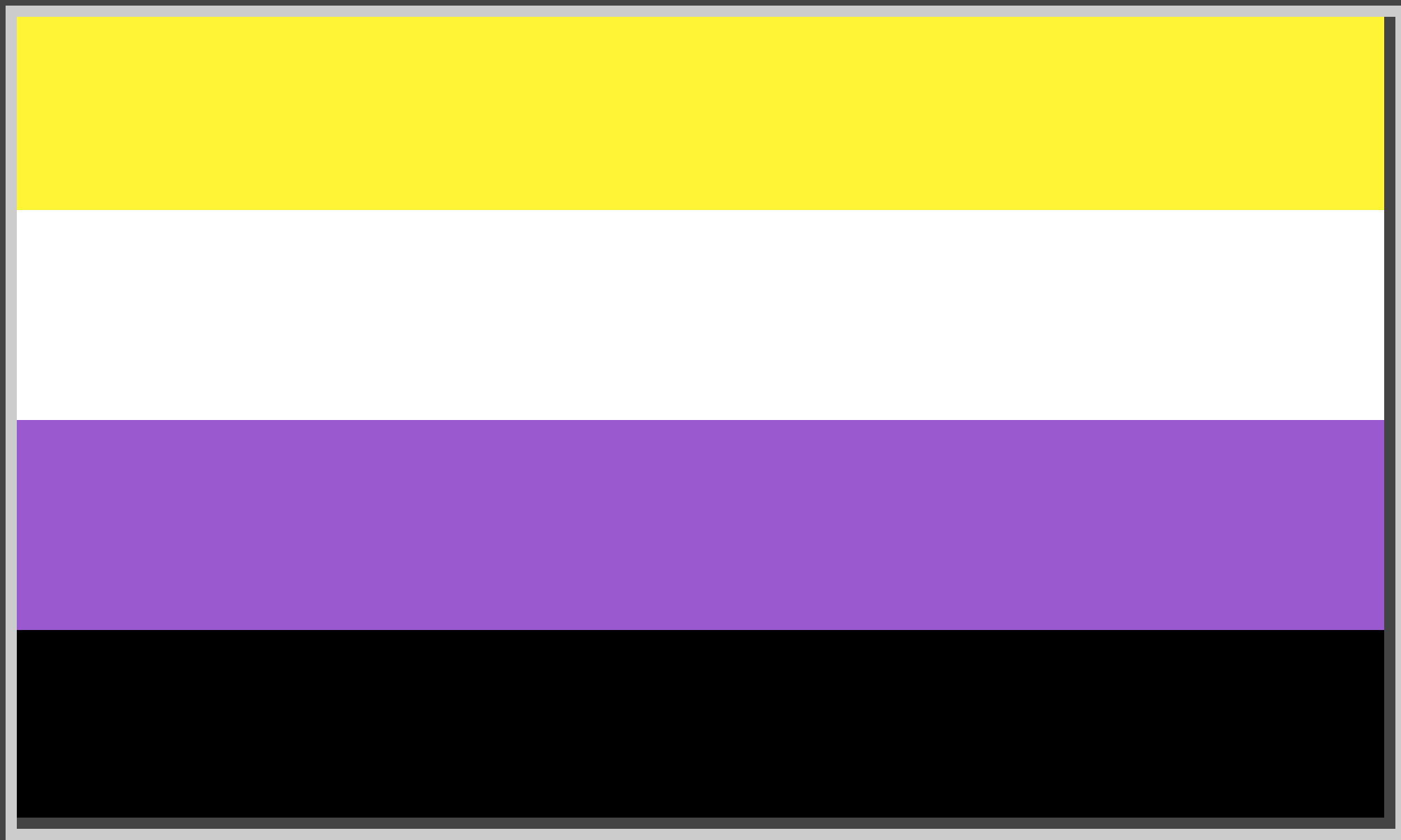 Non-binary pride flag in the usual rectangle shape with a gray groove effect border outlining it so the black and white stripes don't "disappear" on either a white or black background background, would be easy to edit the svg to remix for other 4 horizontal stripe flags. A remix of my own work https://openclipart.org/detail/344086/non-binary-pride-flag-square-icon and https://openclipart.org/detail/344101/non-binary-pride-flag-white-border