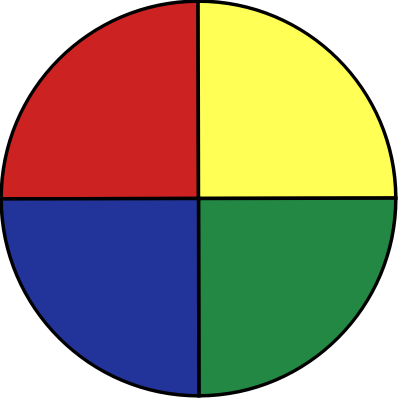 A circle or wheel with 4 differently colors quarters outlined in black.