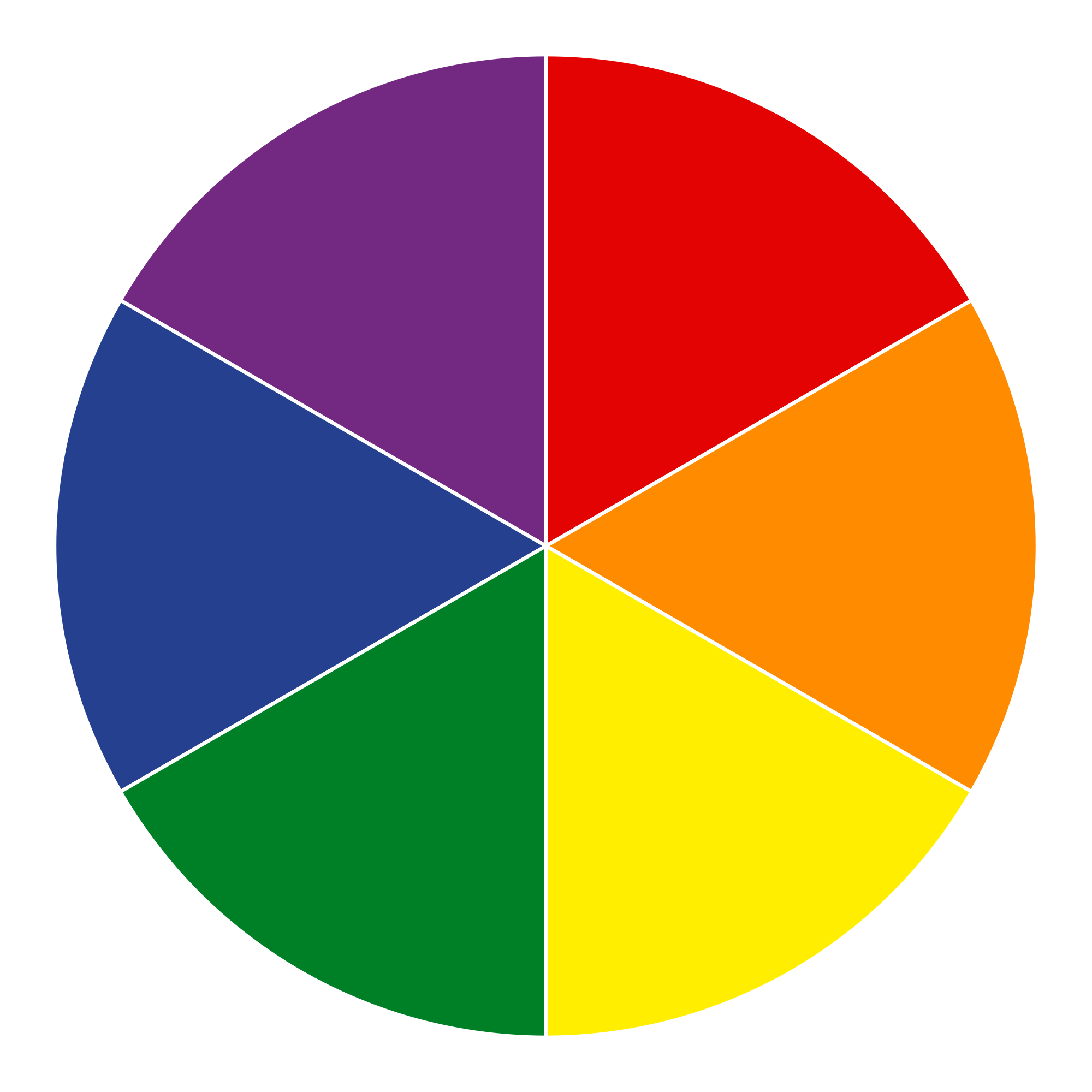 A pie chart or circle of 6 identical pieces with 60 degree angles in rainbow / pride colors similar to trivial pursuit piece.