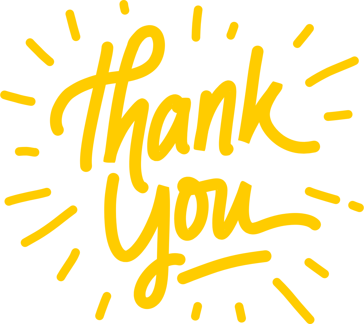 Yellow handwritten text saying thank you surrounded by lines, transparent background. A remix of https://openclipart.org/detail/344139/thank-you-black-lines-remix-of-thankcard and a remix of the original. Thank you in black text with surrounding lines on transparent background. A remix of a public domain image from pixabay (Feb 2018, before license change). Pixabay image is thank-card-text-writing-lettering-3148710