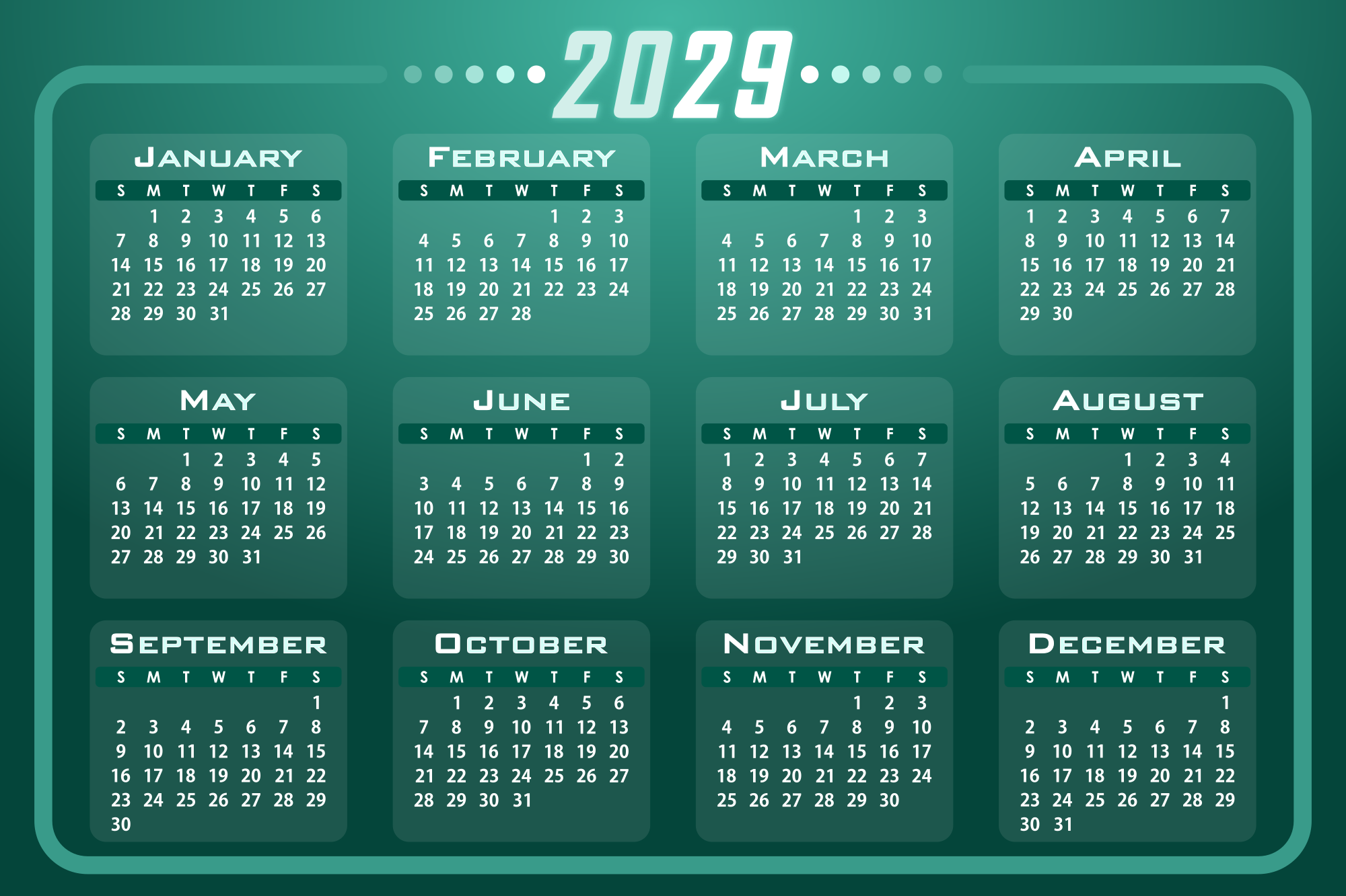 A calendar design for the year 2029.