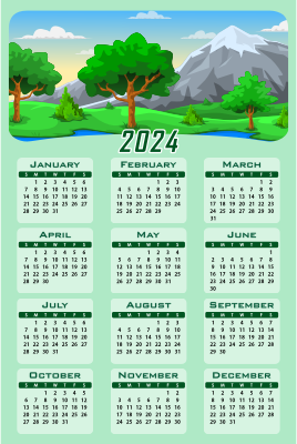Calendar design for the year 2024 in portrait format with beautiful natural landscape.