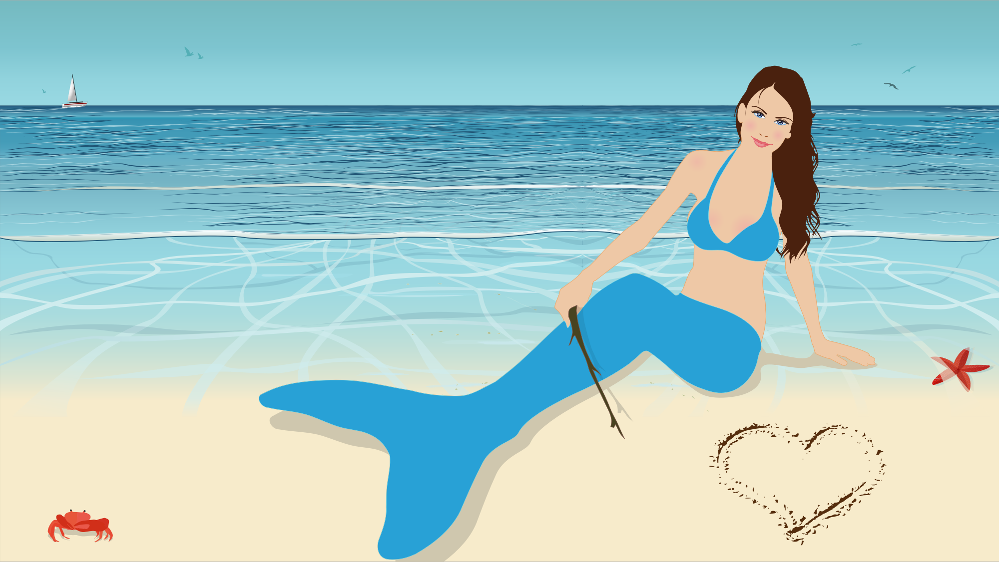 - mermaid beach cosplay costume swimsuit beautiful view model heart in sand starfish crab boat flying birds beautiful landscape dry branch heart fanart sea background blue sailboat waves nymph peace relaxation fantasy