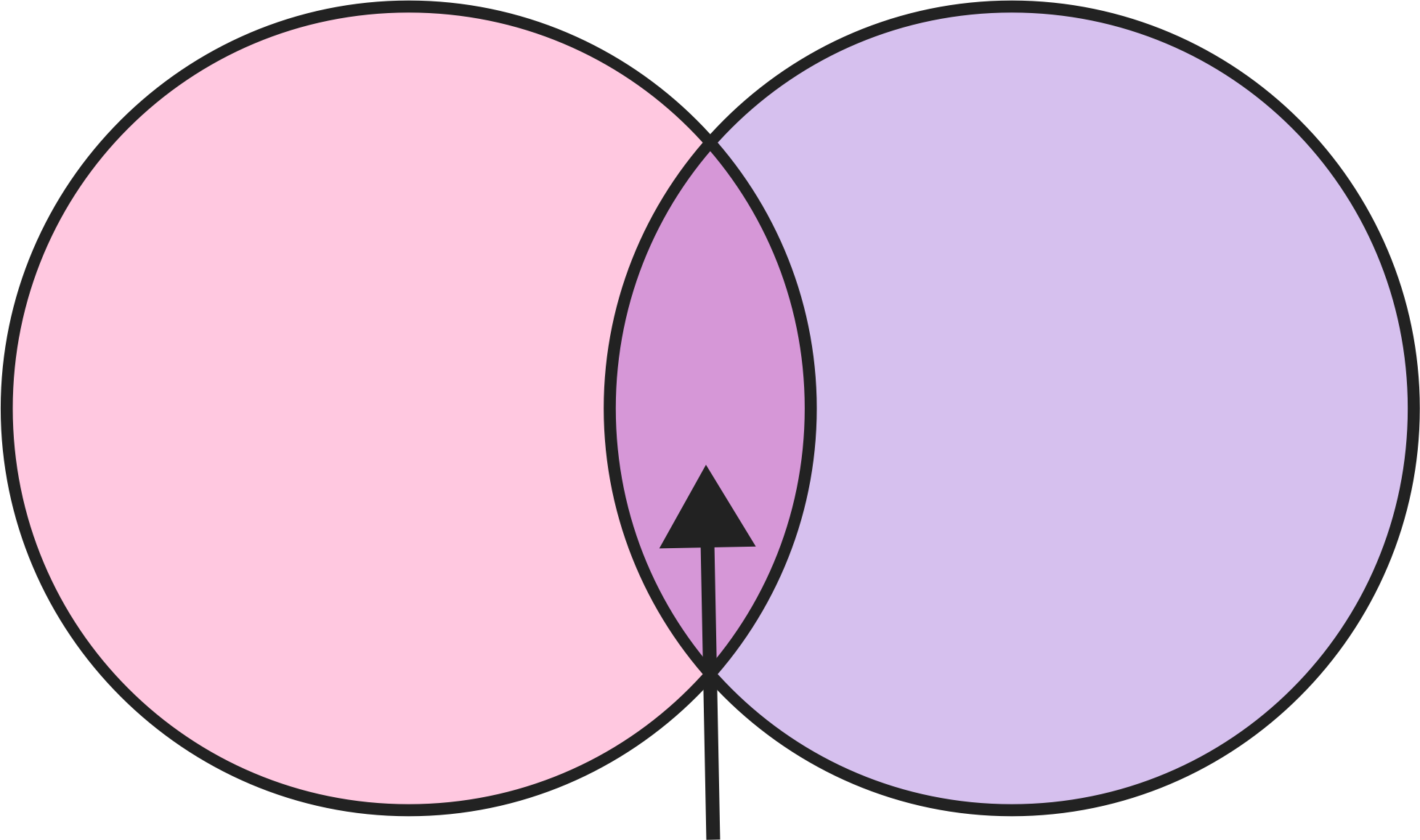 venn diagram with 2 circles overlapping in pink and purple with an arrow pointing to the intersection