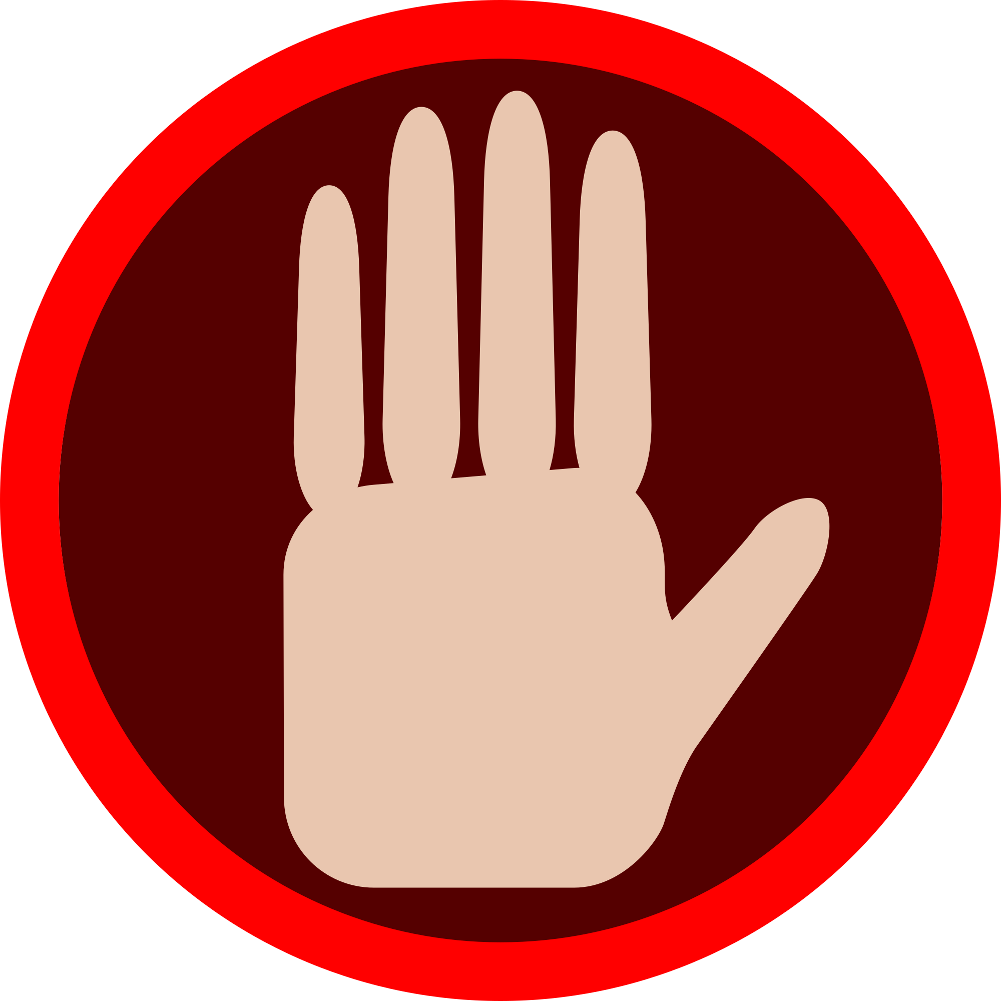 Drawn in Inkscape. Clear messaging not to proceed, yet a bit subtle as it doesn't have "NSFW" or any other indicator that explicitly identifies the type of linked content. An intense red circular frame for attention getting filled in deep red with a hand in the universal stop or halt position in the center.