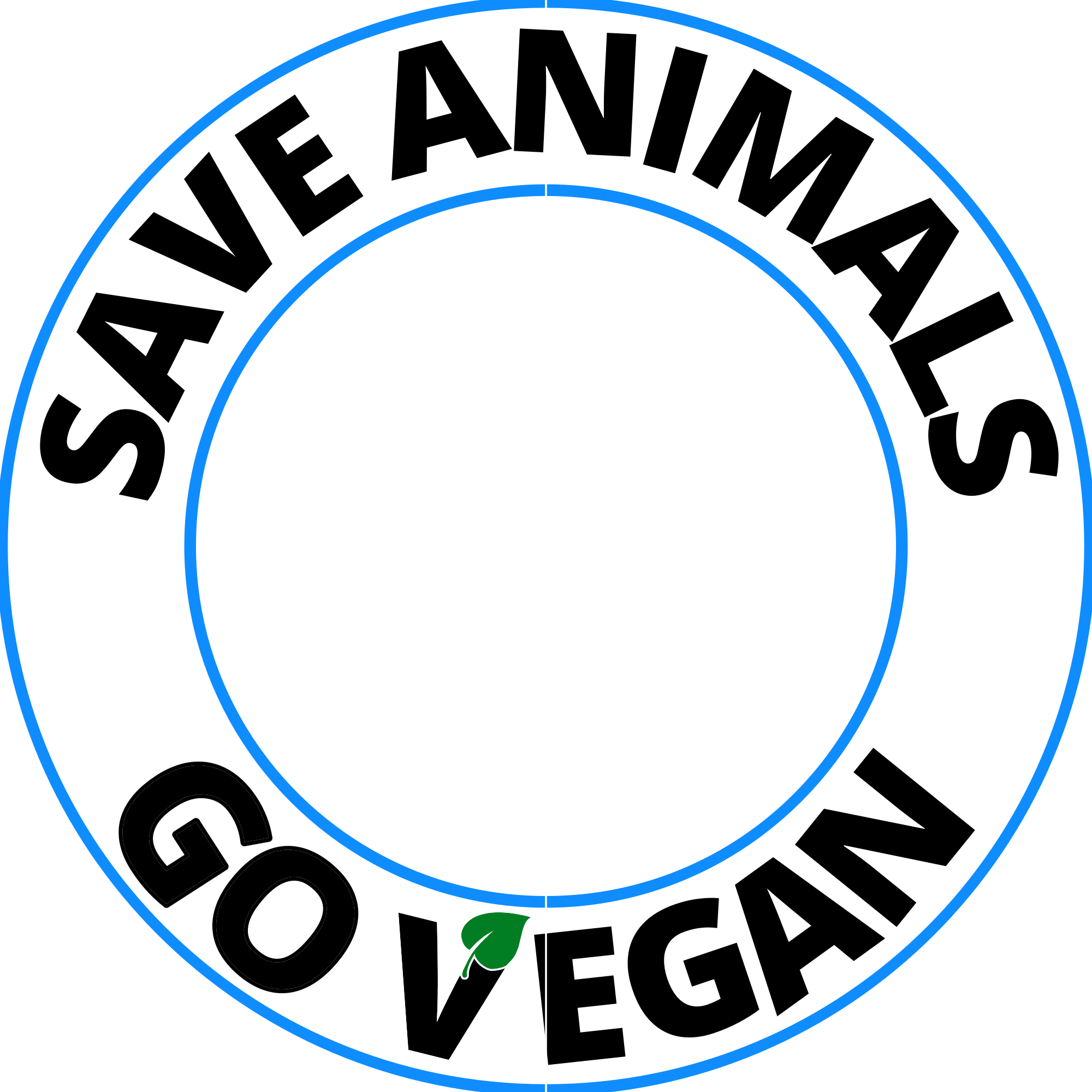 Save animals go vegan motto in a round design on a white circle with transparent background and some blue