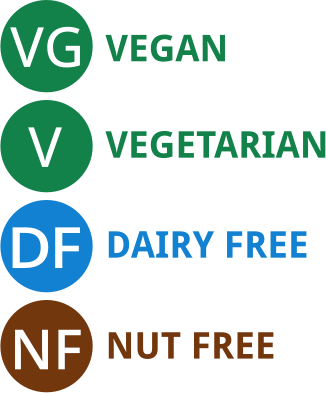 Uppercase V VG DF NF - Vegan, vegetarian and allergen menu symbols, in white on green circle