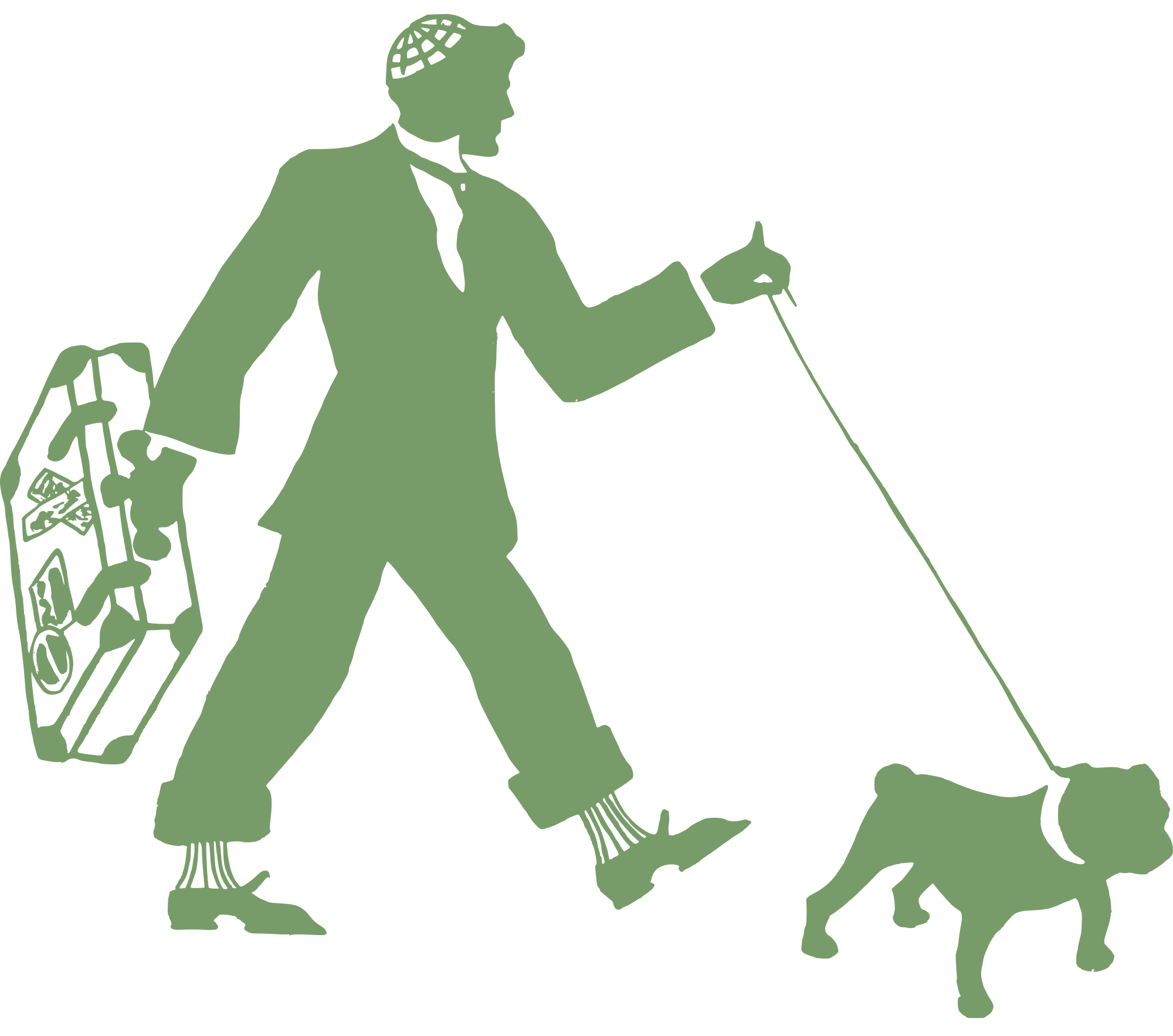 - man dog walking walk suitcase travel male leash silhouette green vintage retro 1910 pitbull dog walking