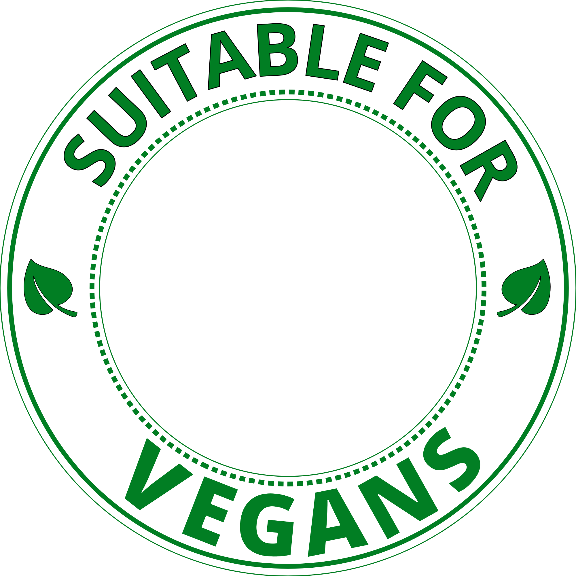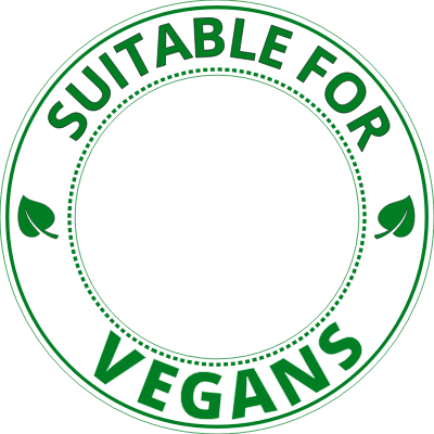 Round label with suitable for vegans in green text, on a white circle, with a transparent center