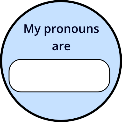 My pronouns are round blue badge with space to write in pronouns. Putting pronouns on a badge or announcing your name and pronouns together helps give an inclusive environment for non-binary and transgender people whose pronouns may not be obvious. See also https://openclipart.org/detail/345244/lgbt-pride-flag-pronouns-badge-square