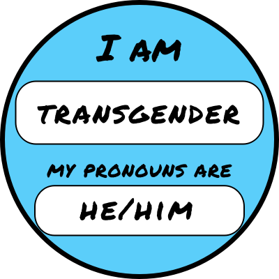 Round blue badge saying "I am transgender" and pronouns he / him in transgender pride blue.