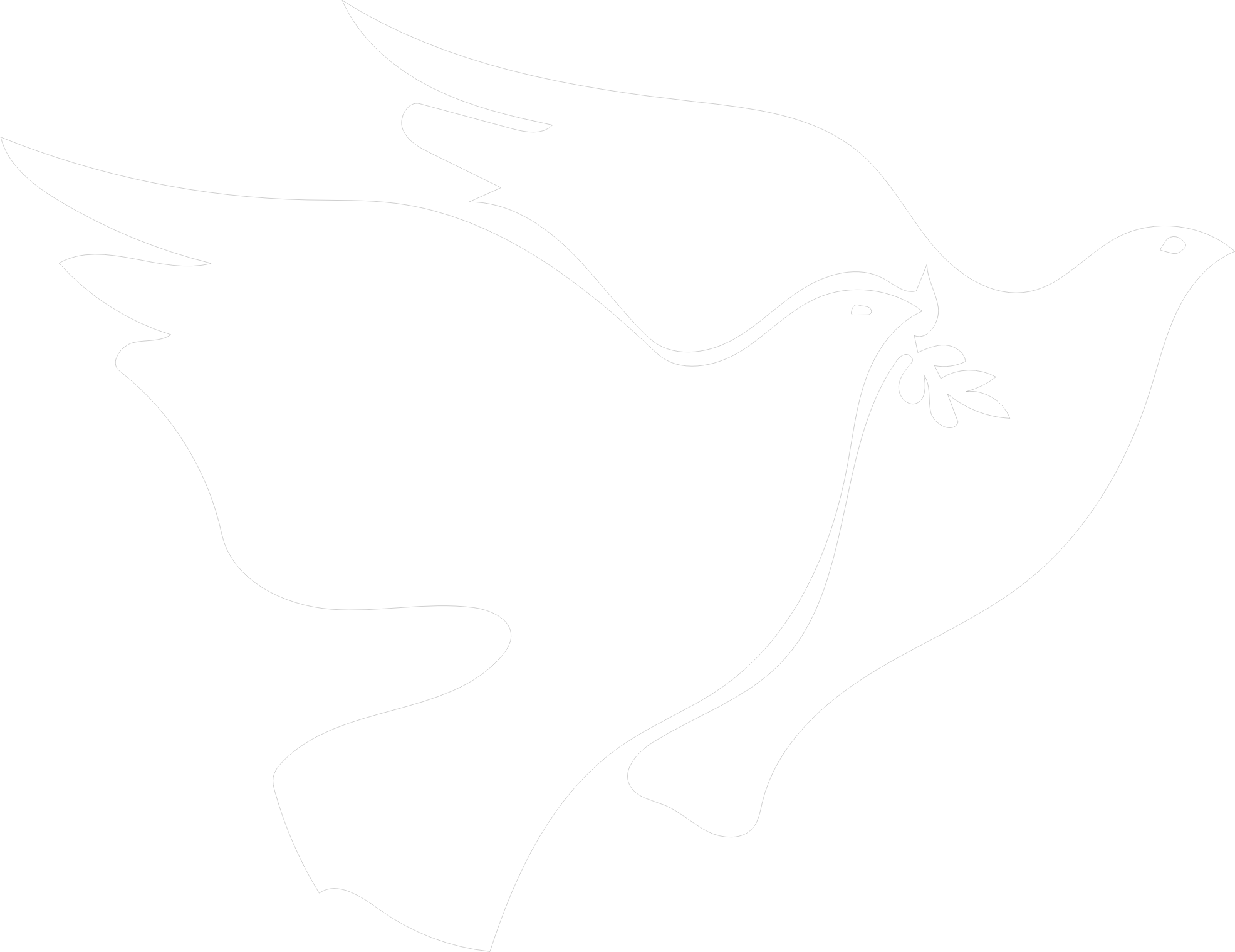 Two white doves flying together, one holding an olive branch, with very thin black outline. For use over dark or patterned backgrounds or as a mask in graphics editing. From the freeware font Afrika Images F mBizo Font, using letter { https://www.fontspace.com/afrika-images-f-mbizo-font-f3367