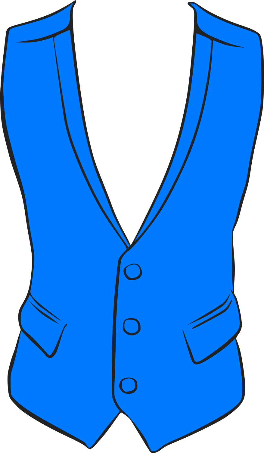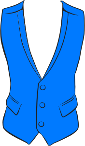 Blue waistcoat with black edging and details like buttons and pockets