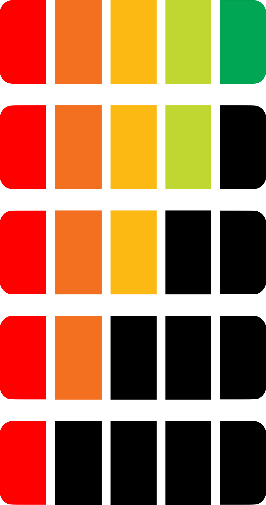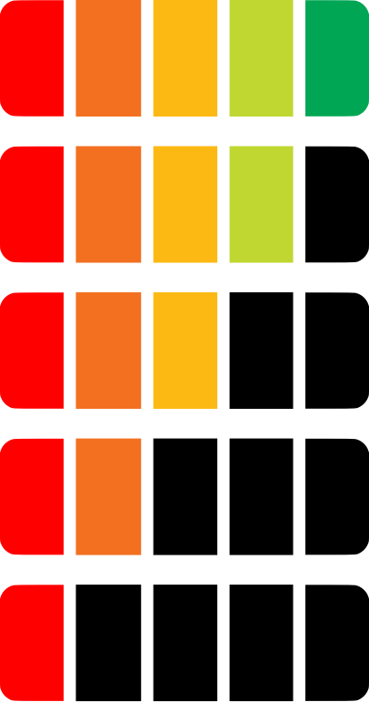 Green, light green, yellow, orange, red and black showing decreasing or declining levels (or the reverse).