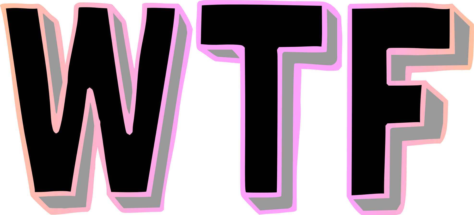 WTF in capitals with gray shadow, orange to pink gradient outlining and black text. No shading effects. Uses the zuka doodle freeware font by cove703.