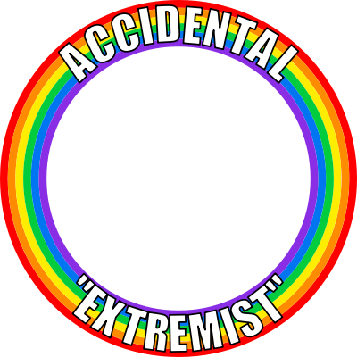 LGBT+ pride round frame with the words "accidental extremist", reflecting Putin declaration LGBT rights an "extremist" movement