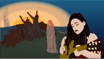 I have been looking for images of Brighid and found one but i had to reimagine it a bit. This is a combination of three images -commons.wikimedia.org/wiki/File:A_Celtic_Goddess_Holding_a_Lute_-_George_William_Russell.png, File:The_Passing_of_St._Brighid.jpg, File:Monochrome_girl_plays_guitar_(Unsplash).jpg - from three time periods and styles. but i munged them together to try to tell a story.