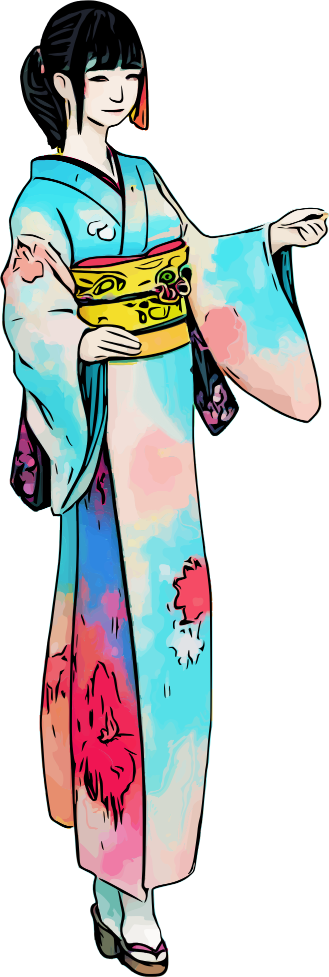a lady in a kimono (although greatly modified by me to try to match the correct folds, this started life as ai art so it has a bit of the "uncanny valley" if you know kimonos well.)