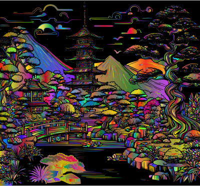 - Japanese Garden Landscape Asian Culture Architecture Line Art Decorative Ornamental Decoration Colorful Prismatic Chromatic Rainbow Psychedelic remix+346830