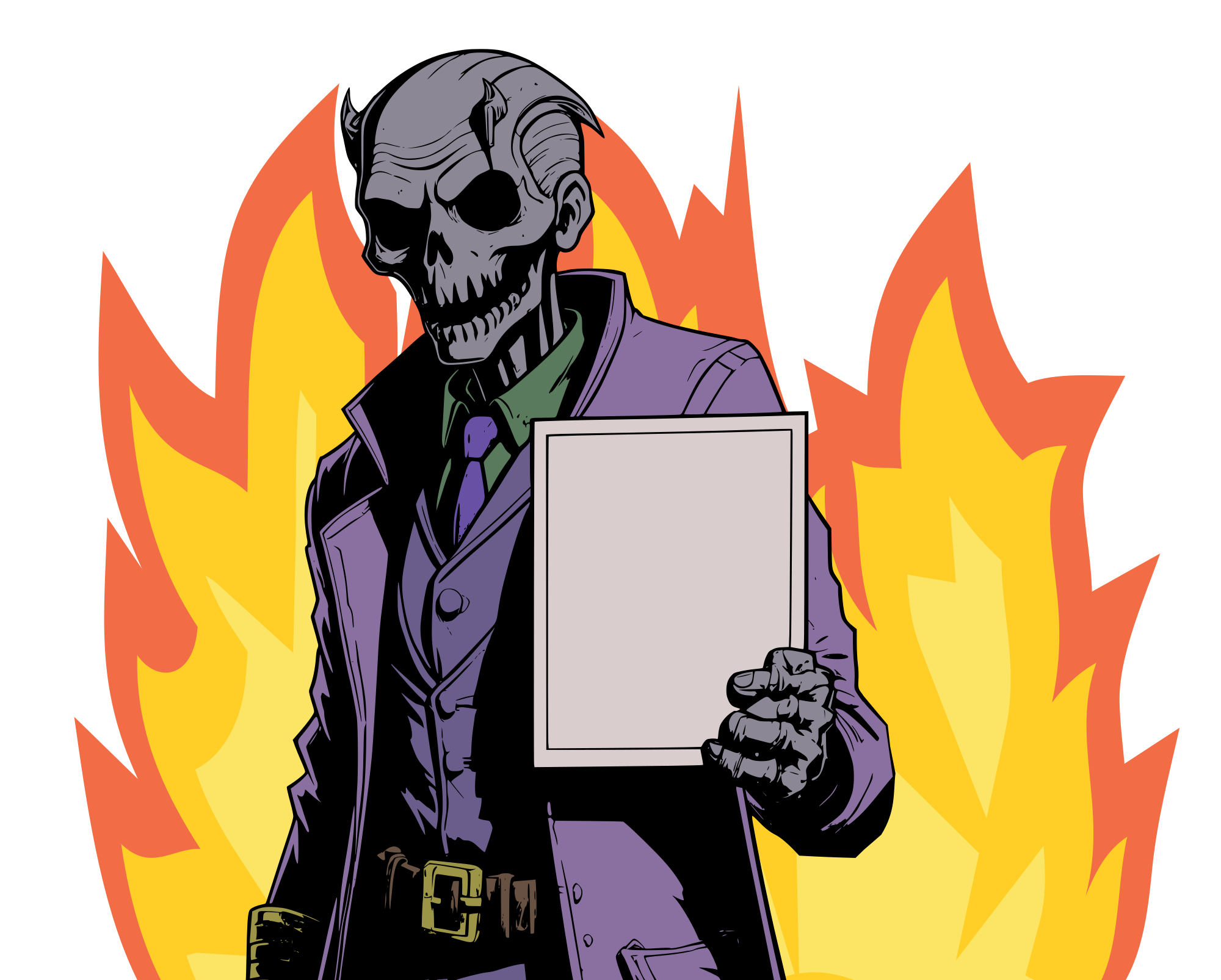a colour remix of this ghoul holding a blank sign--- with flames!