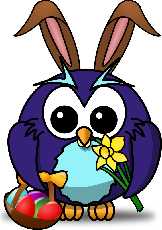Blue owl dressed as an easter bunny with basket and flower.
