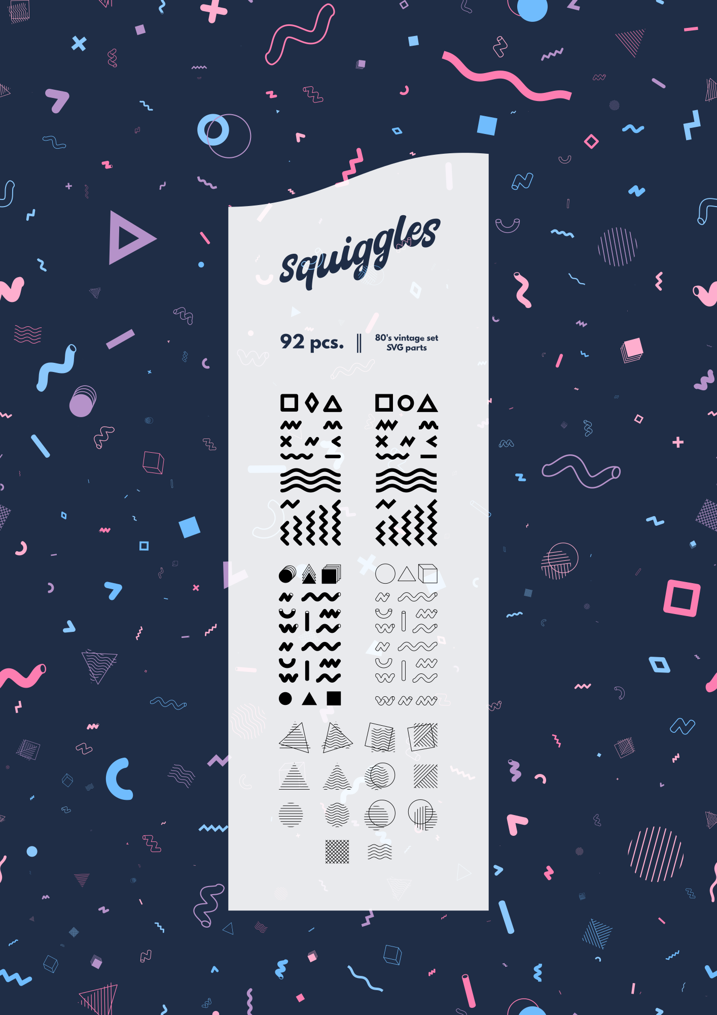 Some geometric parts in 80's retro style. Undefined fill color to ease clones color manipulation with spray tool. The background is made with those clones and ready to turn into a seamless pattern.